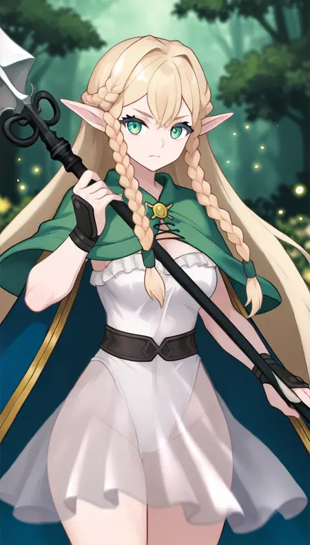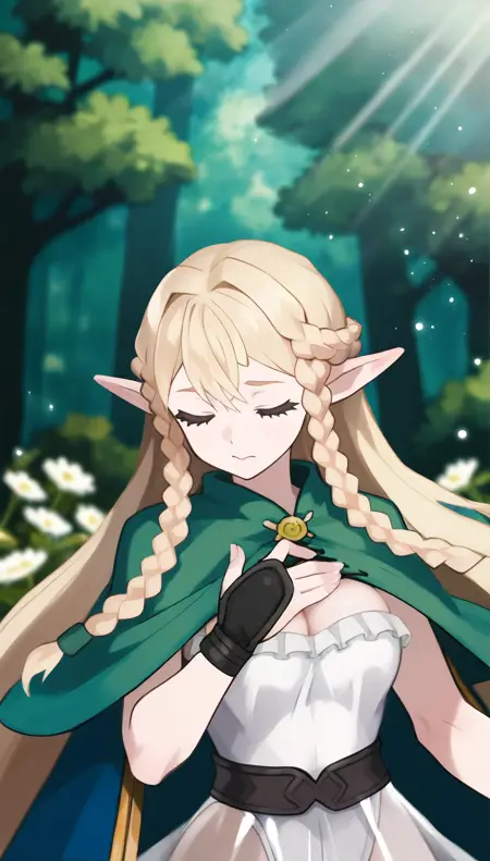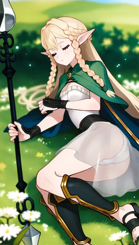 eltolinde, 1girl, solo, blonde hair, long hair, bangs, half updo, braid, green eyes, pointy ears, light yellow cloak, green robe, light yellow waist sash, green socks, light yellow flat shoes,