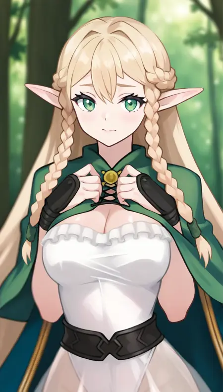 eltolinde, 1girl, solo, blonde hair, long hair, bangs, half updo, braid, green eyes, pointy ears, white dress, orange belt, white heels,