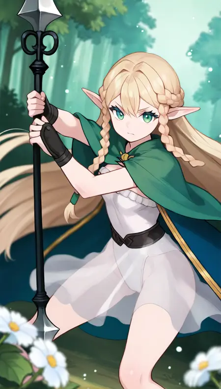 eltolinde, 1girl, solo, blonde hair, long hair, bangs, half updo, braid, green hairtie, green eyes, pointy ears, green cape, deep green cloak, white leotard, black belt, sheer skirt, black wrister, black sandals, black legguard,