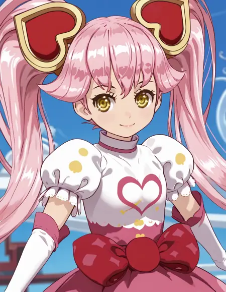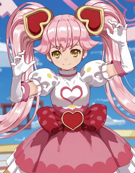 ririka, magical girl, twintails, pink hair, long hair, gloves, yellow eyes, hair ornament, heart hair ornament, dress, elbow gloves, puffy sleeves, white gloves, short sleeves,