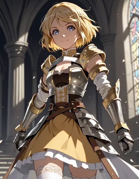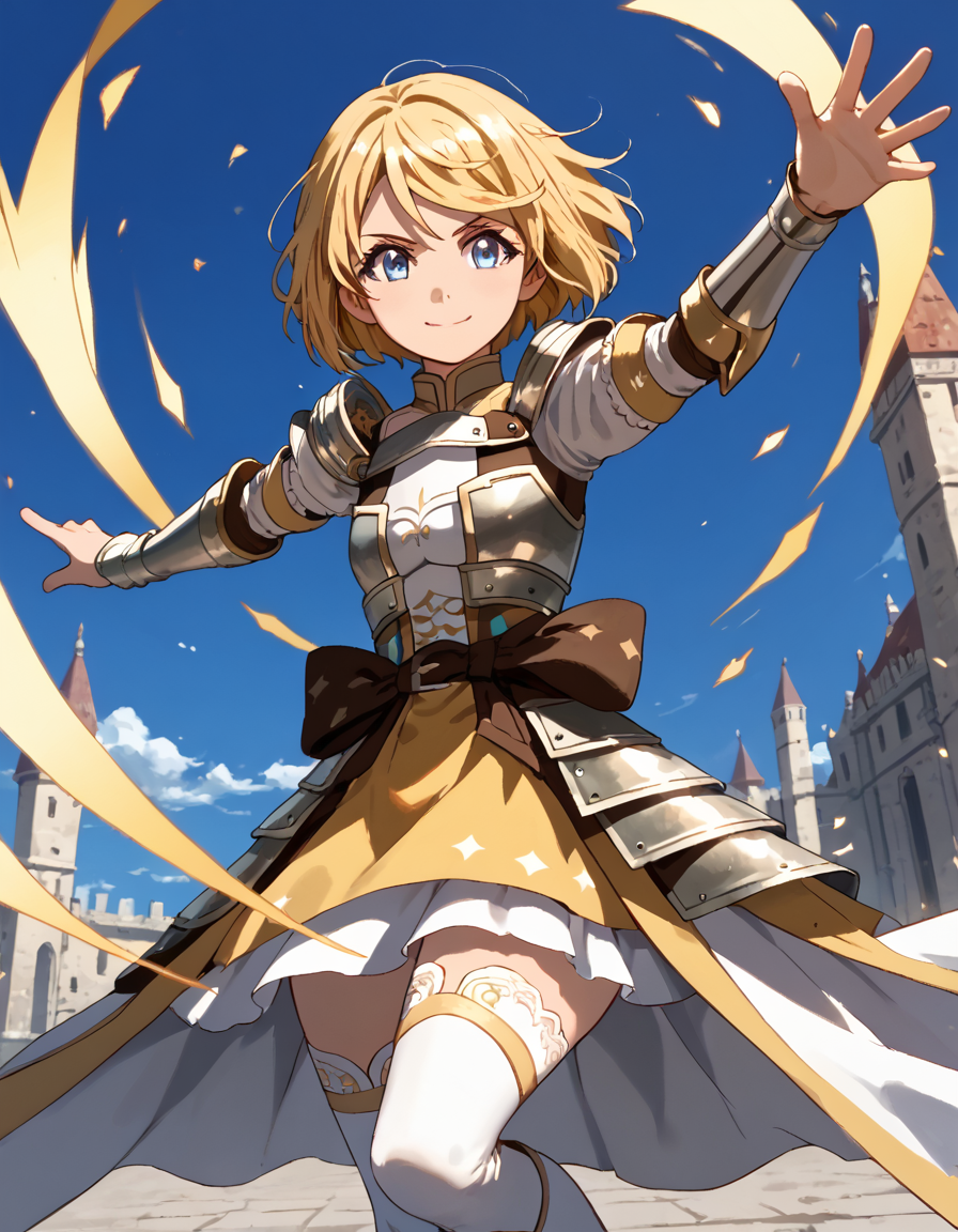 jeannedarc, blonde hair, thighhighs, short hair, armor, white thighhighs, armored dress, blue eyes,