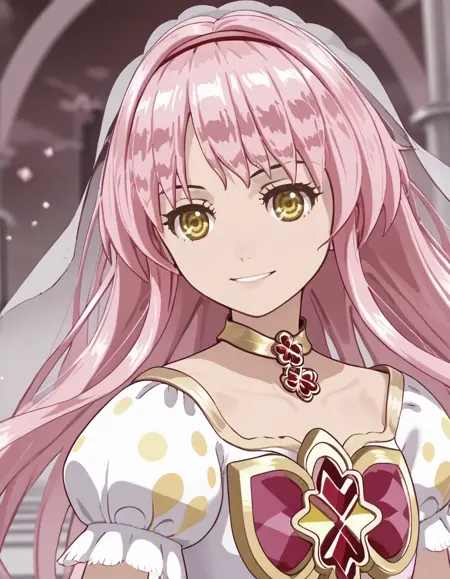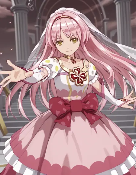 ririkagoddess, long hair, yellow eyes, pink hair, dress, magical girl, veil, choker, jewelry,