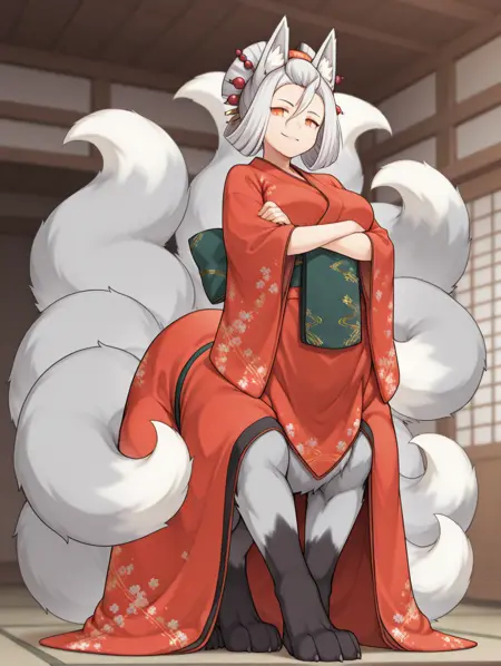 Fujibakama, fox girl, white hair, short hair, hair ornament, orange eyes, (taur), (fox-taur), large breasts, fox tail, six tails, red kimono, green sash,