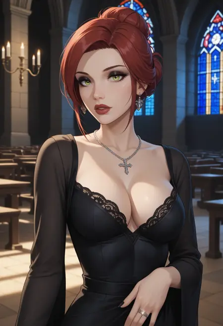 主标签:1girl,单人,绿眼,黄眼,红发,棕发,短发,发髻,乳房,大乳房,嘴唇,妆容,眼影,口红,