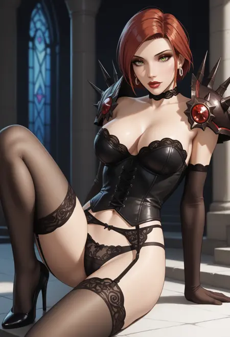服装标签:珠宝,耳环,盔甲,连衣裙,束腰,乳沟,手套,肘部手套,内裤,黑色内裤,内衣,内衣,过膝袜,黑色过膝袜,吊袜带,高跟鞋,