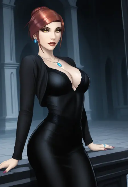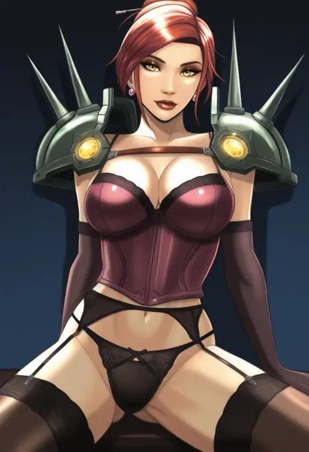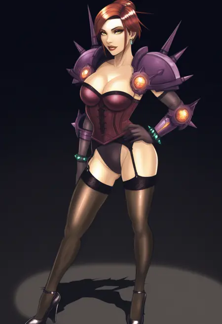 衣装タグ:ジュエリー, ピアス, アーマー, ドレス, コルセット, 胸元, グローブ, 肘までグローブ, パンツ, 黒パンツ, ランジェリー, 下着, シャンクストッキング, 黒シャンクストッキング, ガーターベルト, ハイヒール
