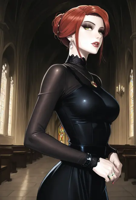 主标签:1girl,单人,绿眼,黄眼,红发,棕发,短发,发髻,乳房,大乳房,嘴唇,妆容,眼影,口红,