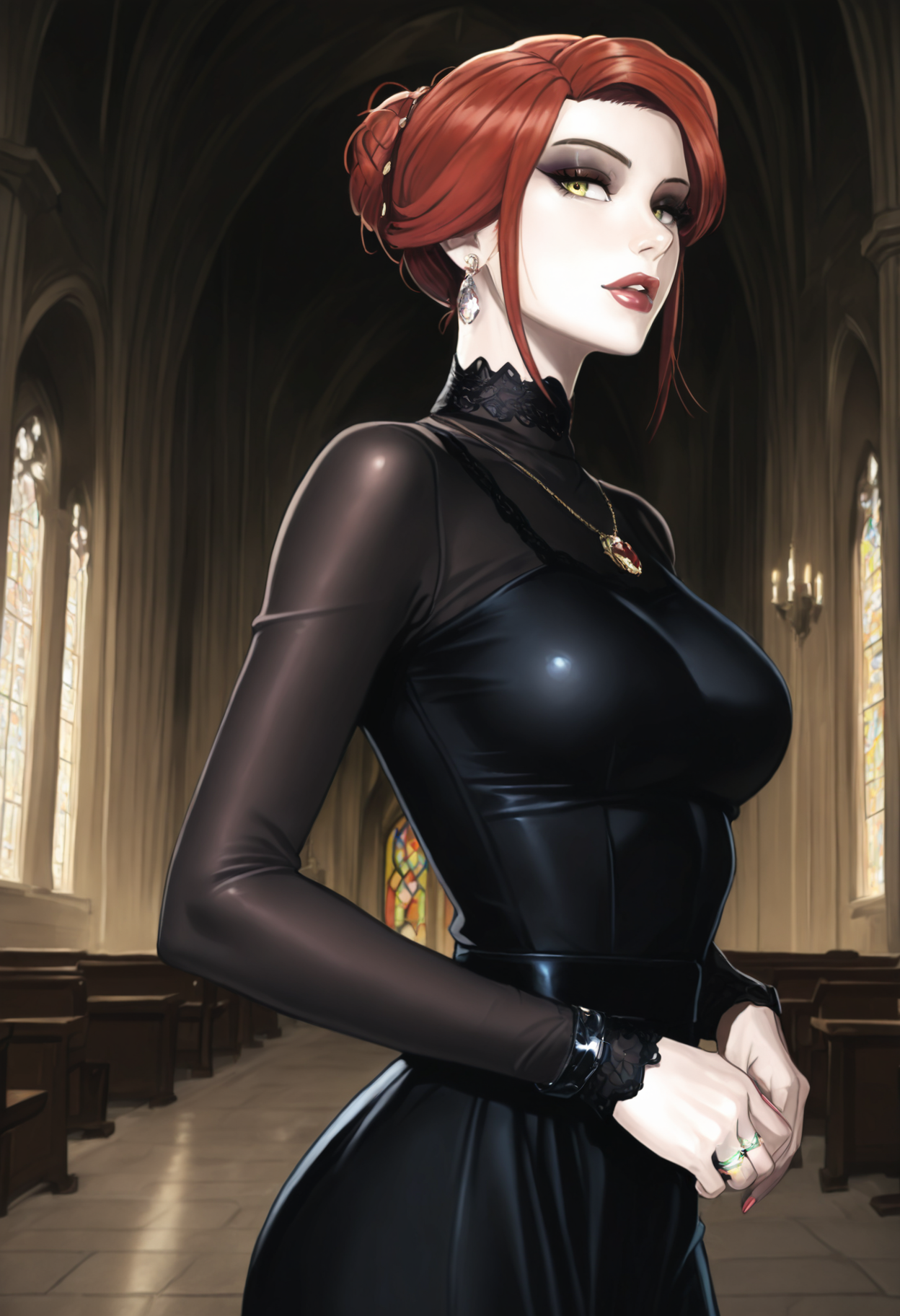 主要タグ:1girl, solo, 緑の目, 黄色の目, 赤髪, 茶髪, 短髪, バン, 髪飾り, 胸, 大きな胸, 唇, メイク, アイシャドウ, リップストップ