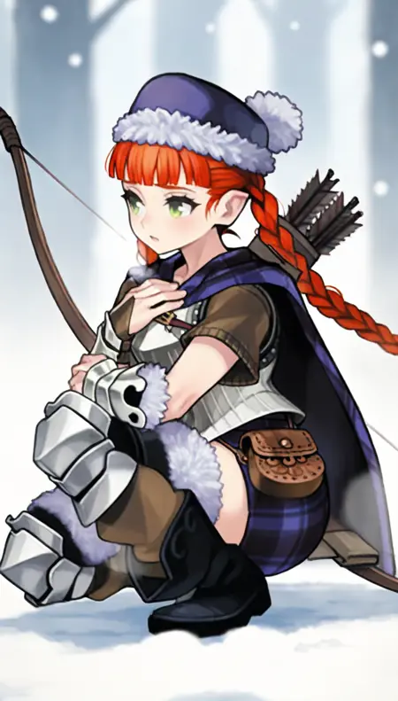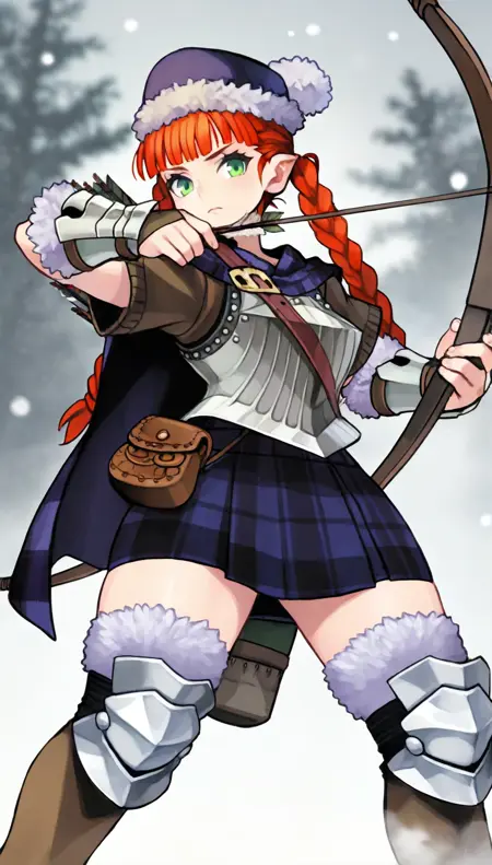 yunifi, 1girl, solo, 주황색 머리, 자주색 모피 모자, 앞머리, 두 줄 땋은 머리, 녹색 눈, 자주색 체크 무늬 망토, 갈색 스웨터 안걸이, 가슴판, 자주색 체크 무늬 치마, 갈색 주머니, 팔보호대, 무릎 보호대, 모피 장식이 있는 하의, 검은 부츠,