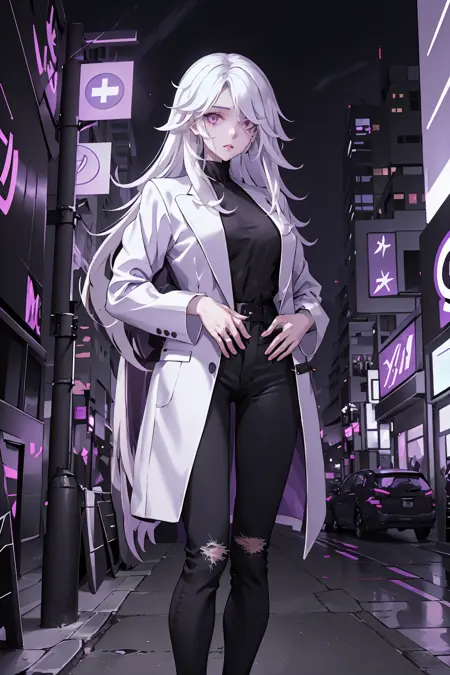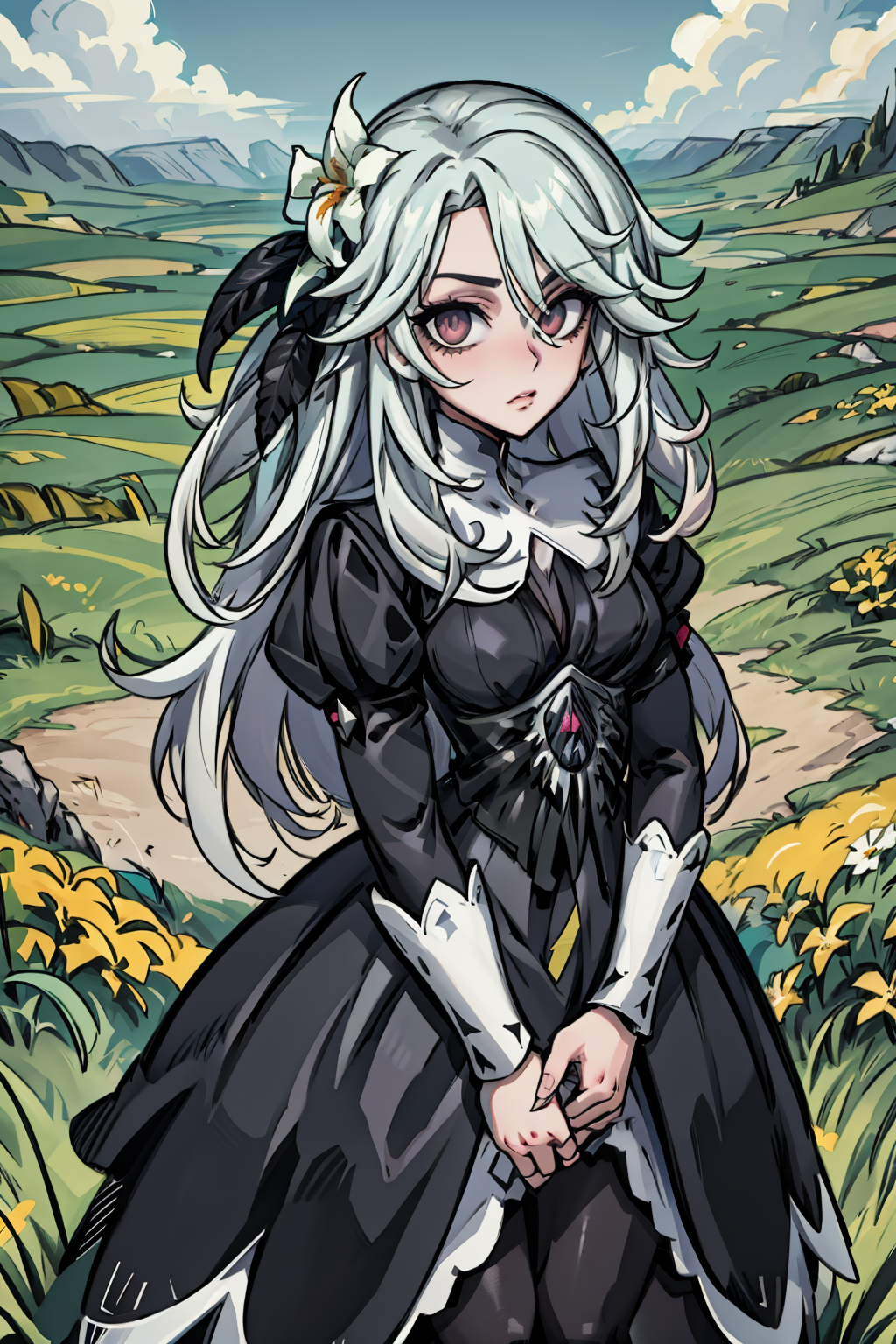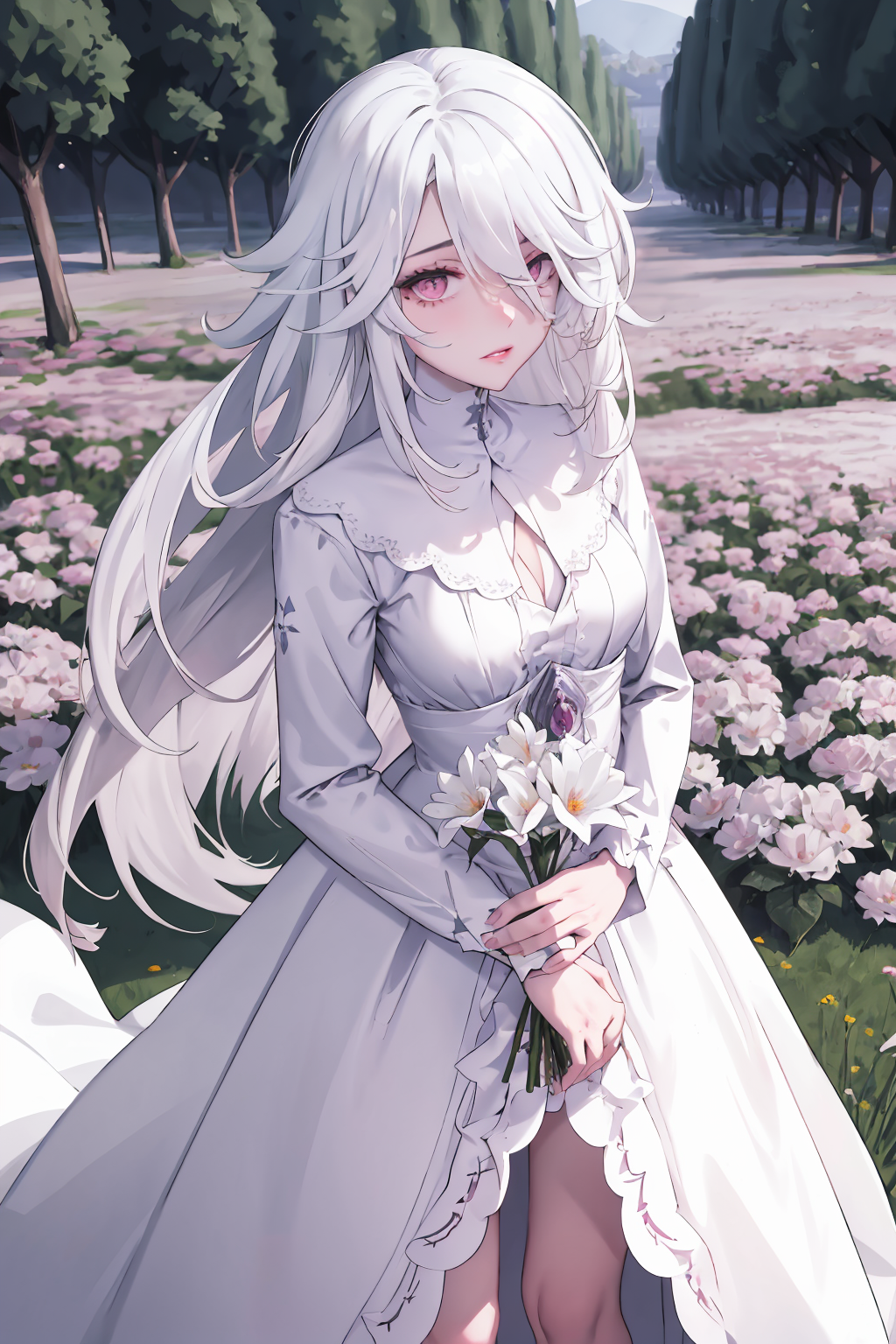chiara, white hair, pink eyes, hair over one eye, mature female(optional)