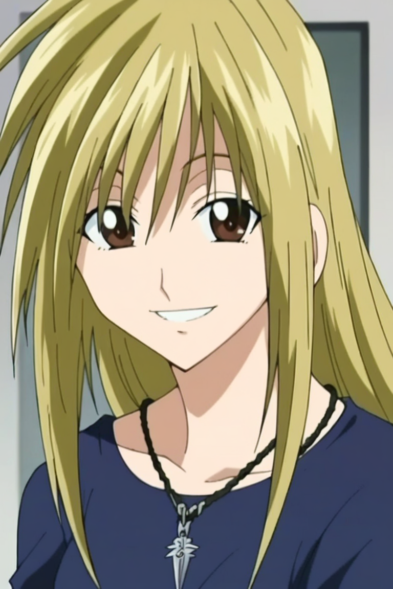 t0ram1zuMT, blonde hair, long hair, brown eyes, necklace, shirt, long sleeves, jeans