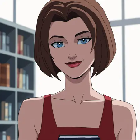 Without mask: 1girl, petraparker, blue eyes, brown hair, bob cut, lipstick, mask removed, bodysuit, print bodysuit, spider web print, superhero, breasts
