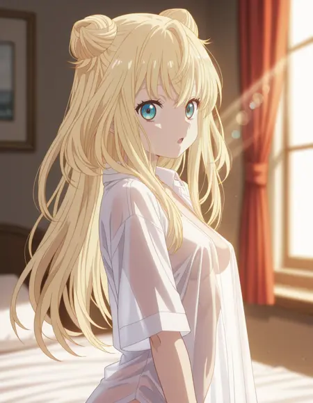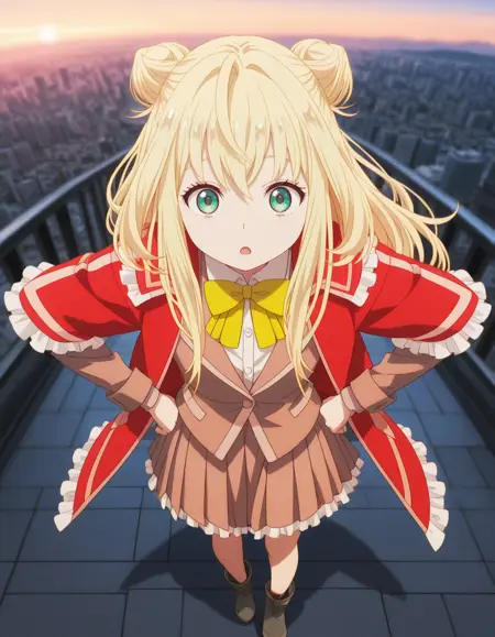 <lora:yuri_kawazu-momentary_lily_s1-pxl-anime-soralz:1>, 요리 카와주 (모멘터리 릴리), 긴 머리, 금발, 머리묶음, 더블 붐, 사이드록, 파란 눈, 녹색 눈