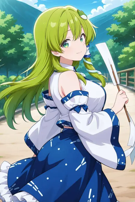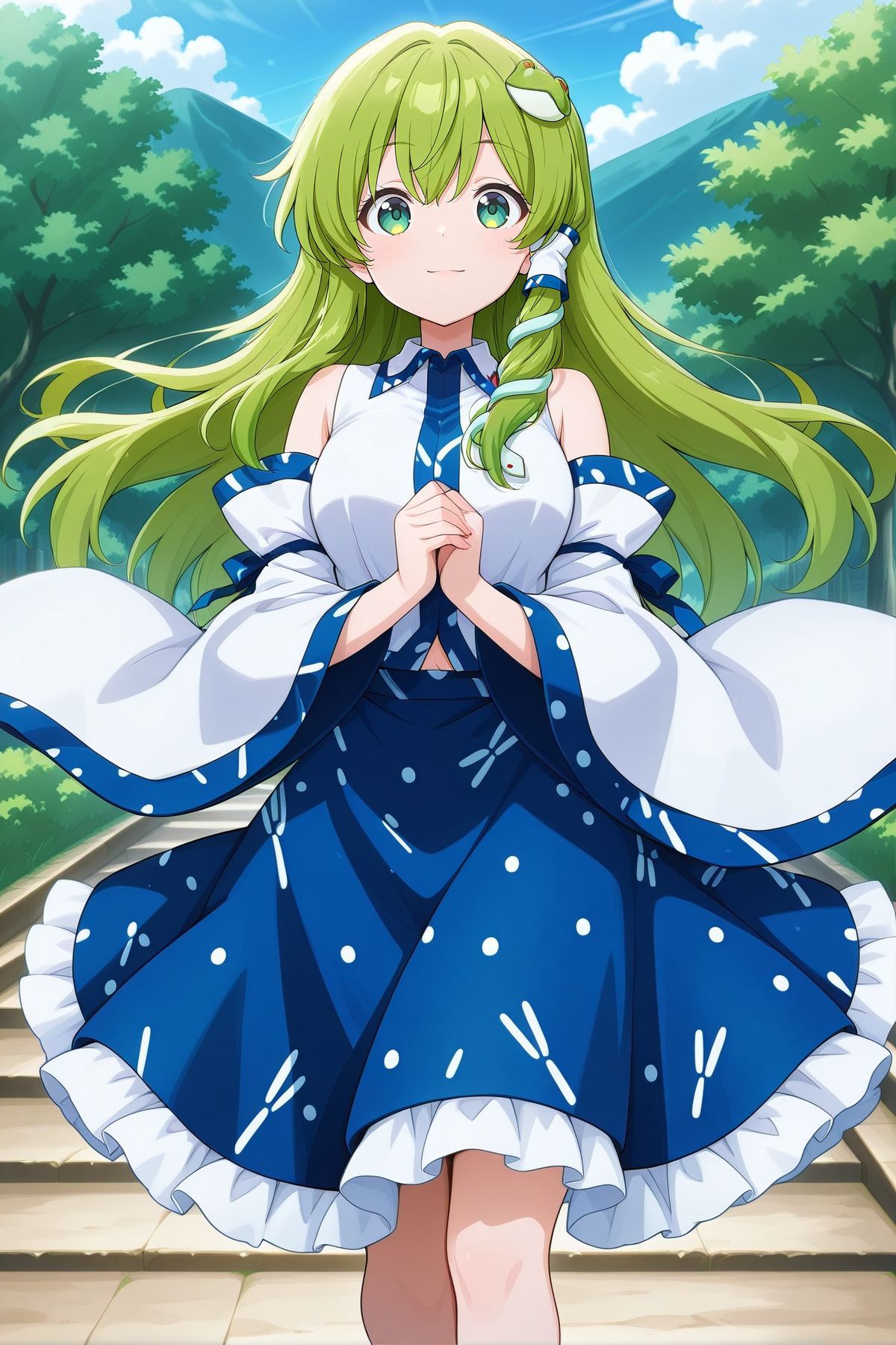 kochiya sanae, 1girl, solo, green eyes, green hair, long hair,