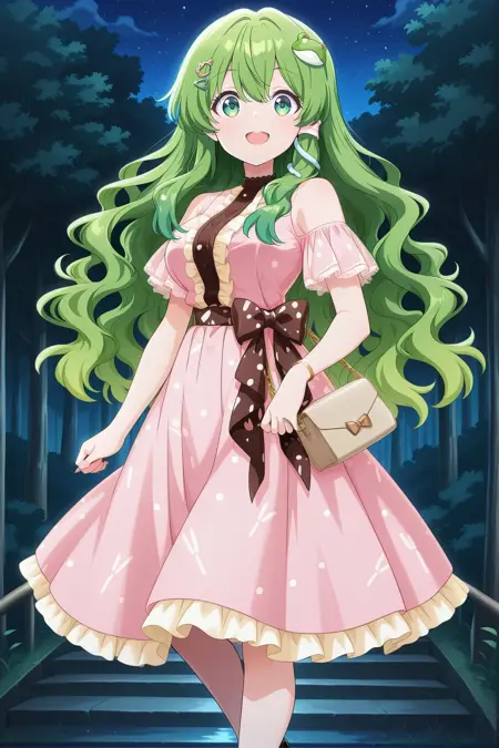 kochiya sanae, 1girl, solo, green eyes, green hair, long hair, wavy hair, frog hair ornament,, kochiya sanae \(nighttime breath of fresh air\), alternate costume, alternate hairstyle, hairclip, jewelry, black sash, pink dress, pleated dress, frilled dress, short sleeves, brown bow, bracelet, high heels, pocketbag,