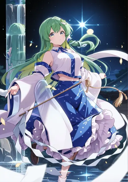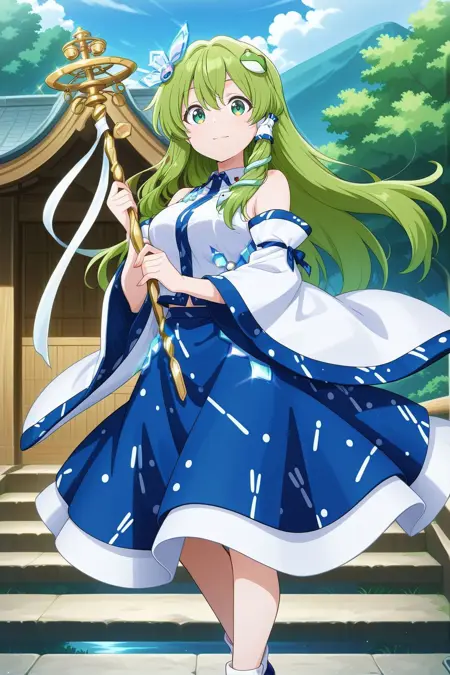 kochiya sanae, 1girl, solo, green eyes, green hair, long hair, kochiya sanae \(hand in hand with a miracle\), adapted costume, crystal hair ornament, white shirt, detached sleeves, wide sleeves, blue skirt, white socks, blue shoes, holding staff, shakujou, staff, crystal,
