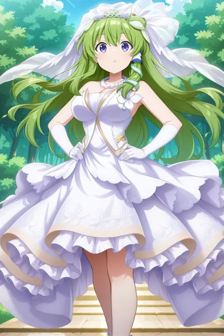 kochiya sanae, 1girl, solo, purple eyes, green hair, long hair, frog hair ornament, snake hair ornament,, kochiya sanae \(broken line of forsaken rites\), alternate costume, bridal veil, white flower, jewelry, white necklace, wedding dress, strapless dress, frilled dress, white dress, cleavage, elbow gloves, white gloves, white footwear, gold trims,