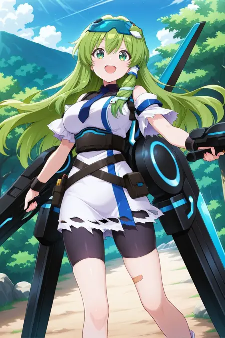 kochiya sanae, 1girl, solo, green eyes, green hair, long hair, kochiya sanae \(lunar war oracle\), alternate costume, goggles on head, blue goggles, blue necktie, white shirt, short sleeves, detached sleeves, torn sleeves, black shorts, bike shorts, bandaid on leg, torn clothes, flight pack, black boots, white socks, pouch, weapon, cannon,