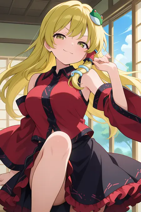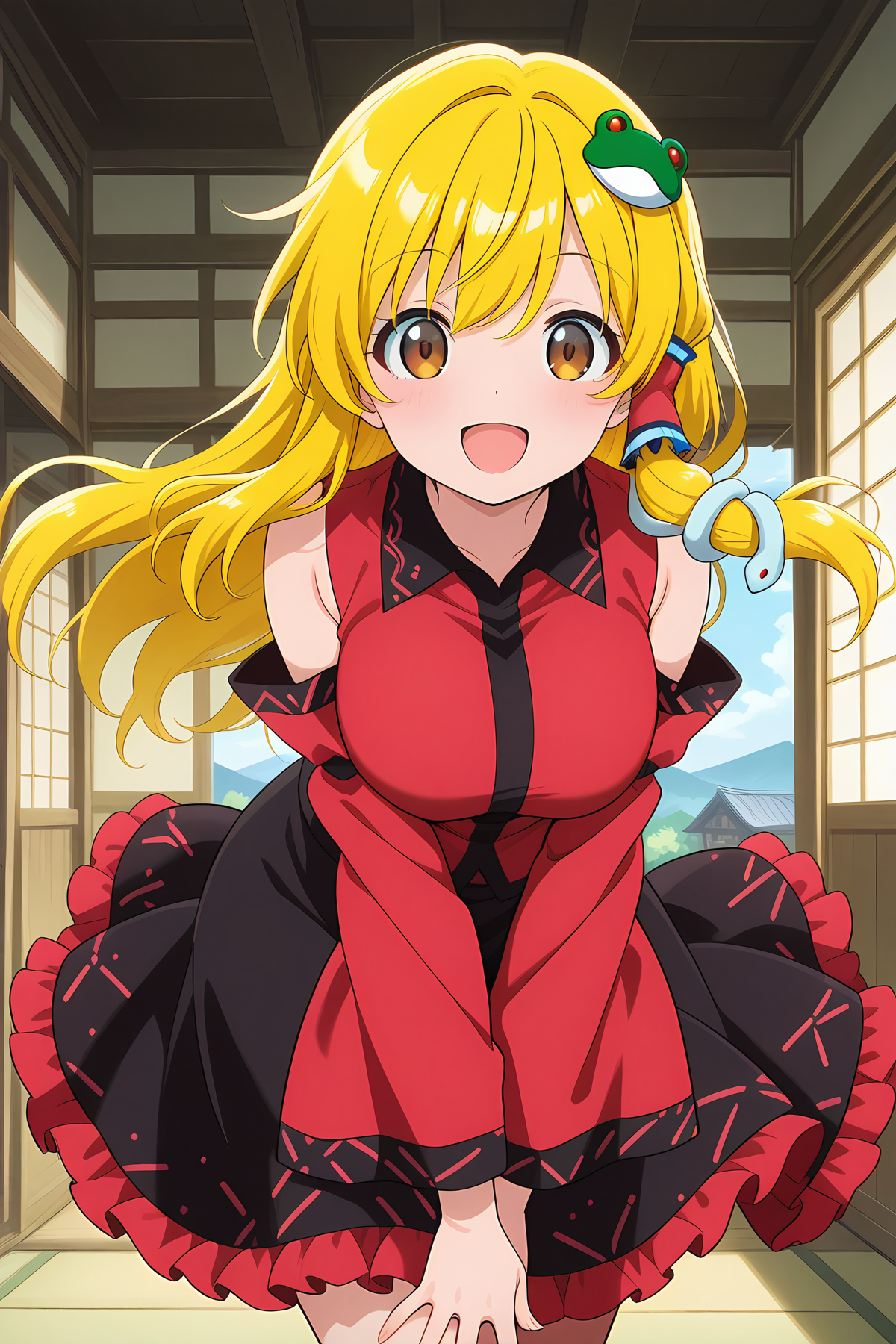 kochiya sanae, 1girl, solo, blonde hair, long hair, brown eyes,, frog hair ornament, hair tubes, snake hair ornament, red tubes,