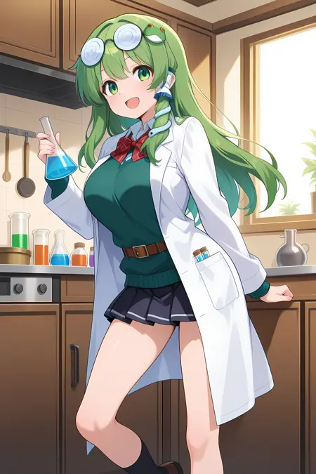 kochiya sanae, 1girl, solo, green eyes, green hair, long hair, kochiya sanae \(naive science club student\), alternate costume, round eyewear, eyewear on head, plaid bow, red bowtie, lab coat, open coat, white coat, green sweater, sweater, test tube, id card, lanyard, belt, pleated skirt, purple skirt, miniskirt, purple socks, brown shoes,