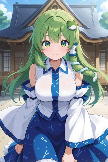 kochiya sanae, 1girl, solo, green hair, long hair, green eyes, skinny, large breasts, frog hair ornament, hair tubes, snake hair ornament,