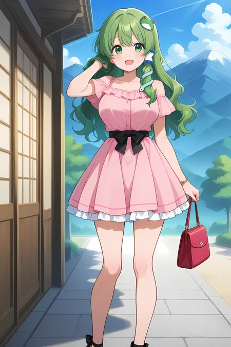 kochiya sanae, 1girl, solo, green eyes, green hair, long hair, wavy hair, frog hair ornament,, kochiya sanae \(nighttime breath of fresh air\), alternate costume, alternate hairstyle, hairclip, jewelry, black sash, pink dress, pleated dress, frilled dress, short sleeves, brown bow, bracelet, high heels, pocketbag,