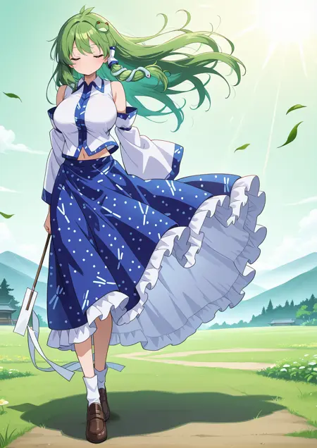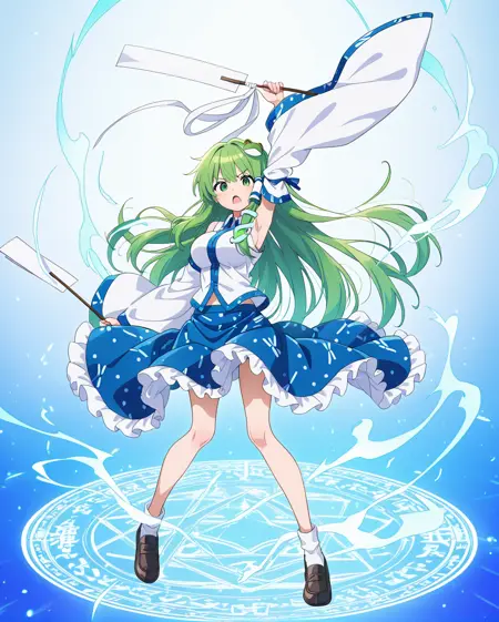 kochiya sanae, 1girl, solo, green eyes, green hair, long hair, kochiya sanae \(hand in hand with a miracle\), adapted costume, crystal hair ornament, white shirt, detached sleeves, wide sleeves, blue skirt, white socks, blue shoes, holding staff, shakujou, staff, crystal,