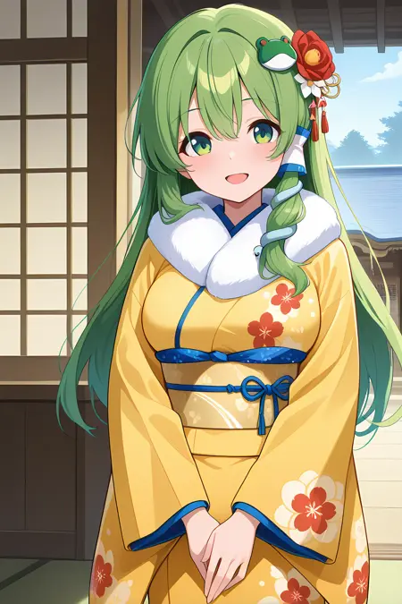 kochiya sanae, 1girl, solo, green eyes, green hair, long hair, kochiya sanae \(victory wind priestess\), alternate costume, alternate hairstyle, hair ornament, hair flower, fur trim, yellow kimono, gradient kimono, green kimono, multicolored kimono, floral print, wide sleeves, long sleeves, furisode, sash, yellow obi, red obijime, footwear flower, white socks, yellow shoes, holding hamaya,
