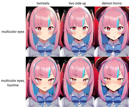 kanan zebel,中等长度头发,恶魔角/两侧向上/双马尾,多色眼睛,细长眼,尖耳朵