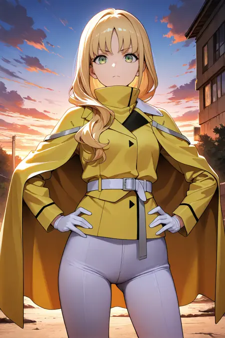 **Outfit 1:**b0seoutf1t,black beret,yellow jacket,white gloves,yellow cape,white belt,white pants,white boots,