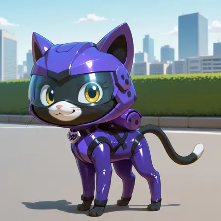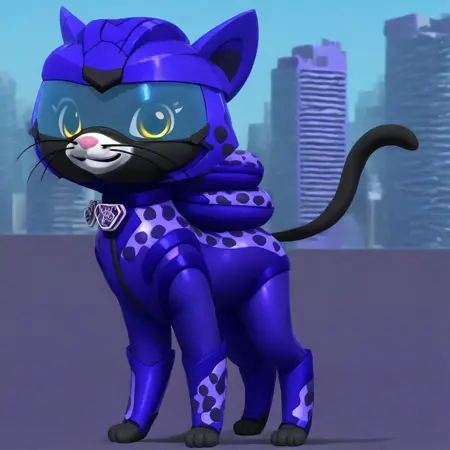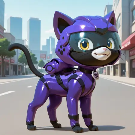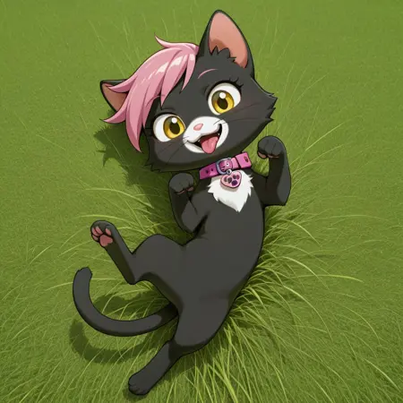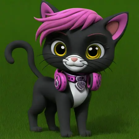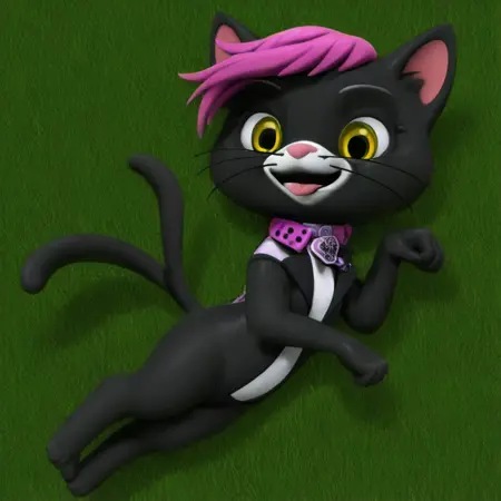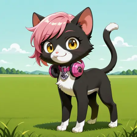 tuxedo cat, black fur, white muzzle, yellow eyes, pink nose, thin tail, paw print tag,