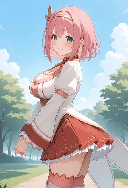 - yuipcdef, 短发, 粉色头发, 蓝眼睛, 大胸, 发饰, 黄色发带, 白色衬衫, 蓬袖, 长袖, 宽袖, 红色裙子, 百褶裙, 粉色过膝袜, 白色过膝靴,