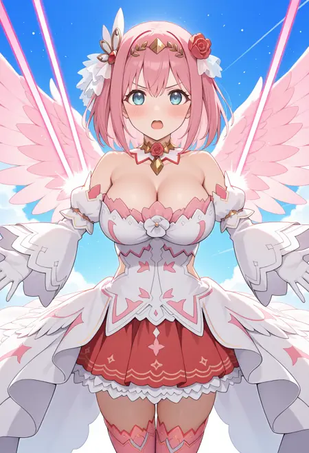 - yuipcpri, 短发, 粉色头发, 蓝眼睛, 大胸, 头花, 王冠, 白色礼服, 印花礼服, 无肩带礼服, 深V领, 可拆卸领口, 花饰, 可拆卸袖子, 宽袖, 白色手套, 红色裙子, 粉色过膝袜, 白色过膝靴, 翅膀,