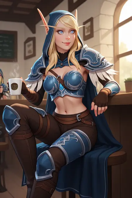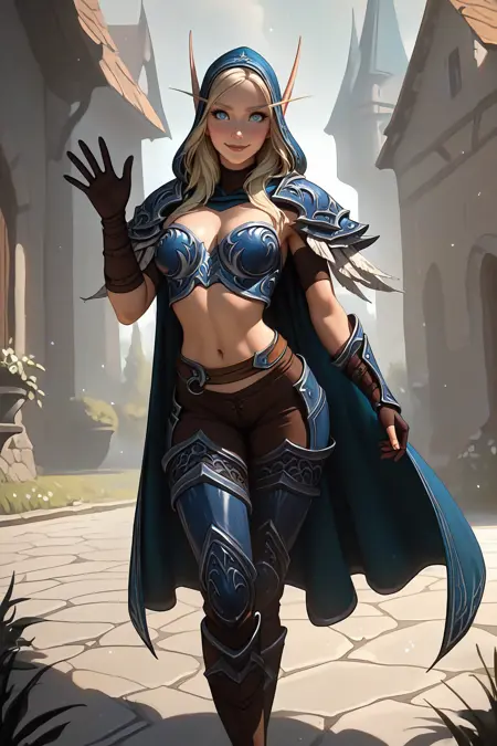 触发词精灵:sylwinog,长发,蓝眼睛,金发,精灵,尖耳朵,肩甲,兜帽,胸甲,腰腹,斗篷,手套,裤子,盔甲,靴子