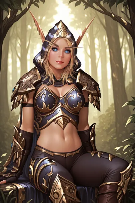 触发词精灵:sylwinog,长发,蓝眼睛,金发,精灵,尖耳朵,肩甲,兜帽,胸甲,腰腹,斗篷,手套,裤子,盔甲,靴子