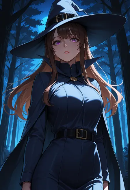 main tags: 1girl, solo, witch, purple eyes, brown hair, long hair, breasts, large breasts,
