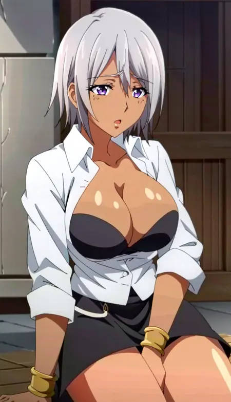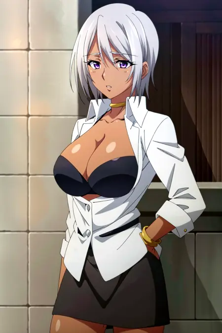 Nana Bassler, 1girl, solo, breasts, dark-skinned female, dark skin, cleavage, jewelry, large breasts, skirt, day, shirt, short hair, bracelet, purple eyes, open shirt, sky, earrings, white shirt, black skirt, bra, handcuffs, choker,