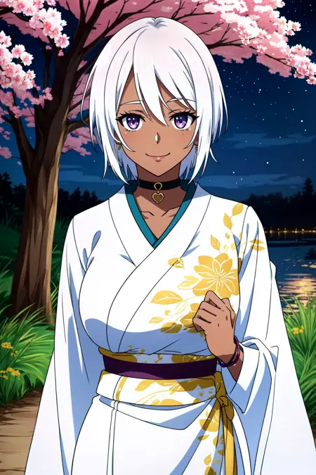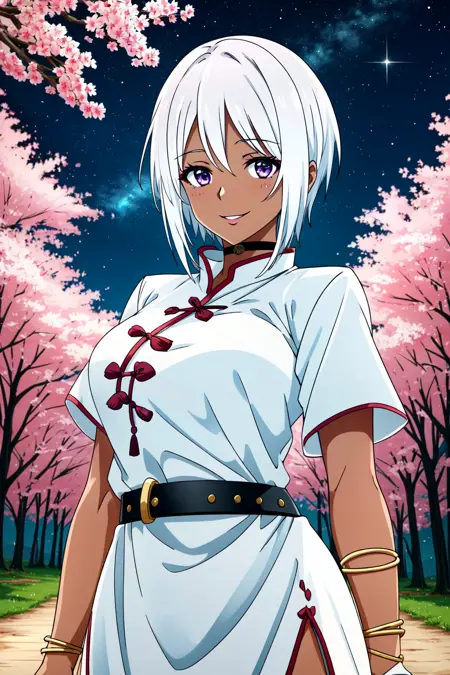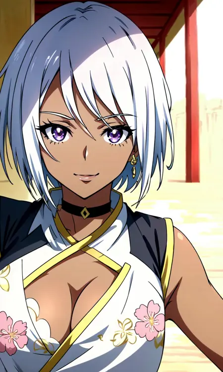 Nana Bassler, 1girl, solo, breasts, dark-skinned female, dark skin, cleavage, jewelry, large breasts, skirt, day, shirt, short hair, bracelet, purple eyes, open shirt, sky, earrings, white shirt, black skirt, bra, handcuffs, choker,
