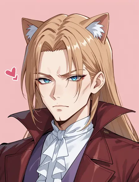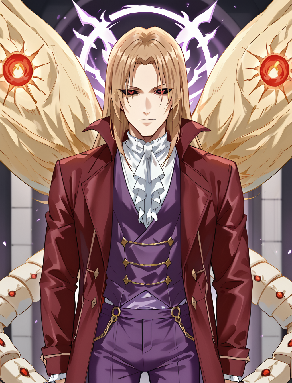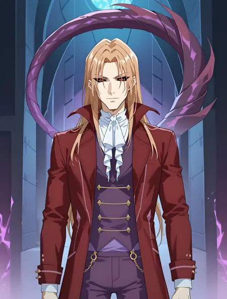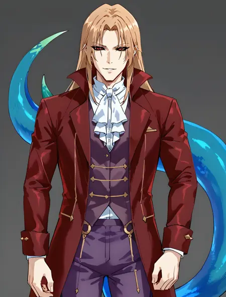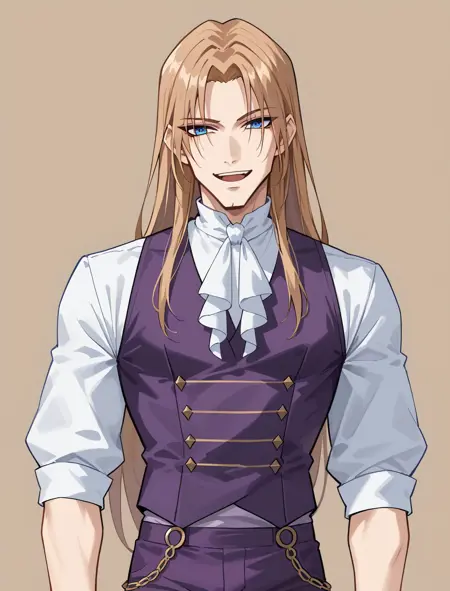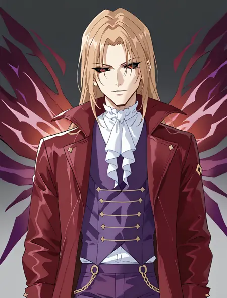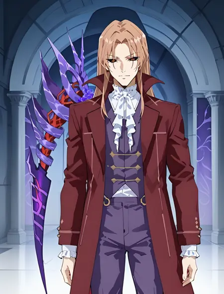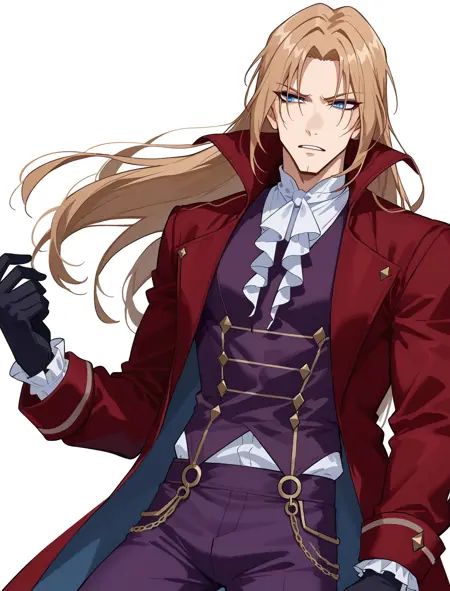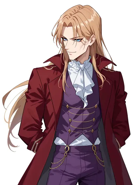 frilled collar, white shirt, purple vest, red jacket, purple pants