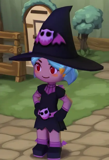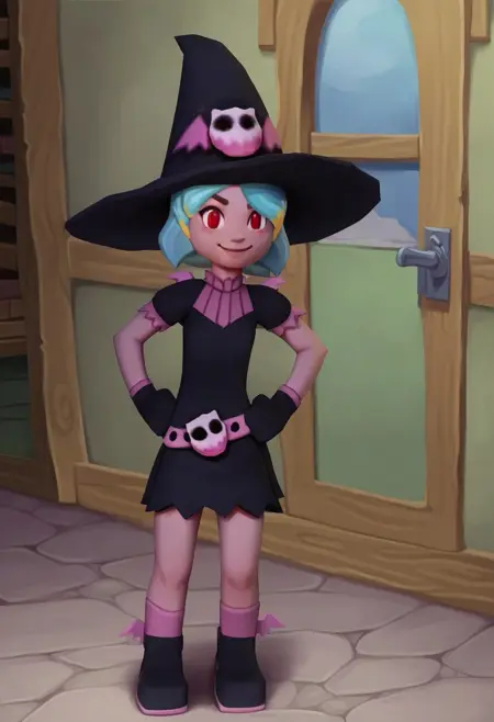 衣装:「魔女の帽子、黒いドレス、黒い手袋、黒とピンクの靴、ピンクのベルト、スカル、ピンクのバックパック」