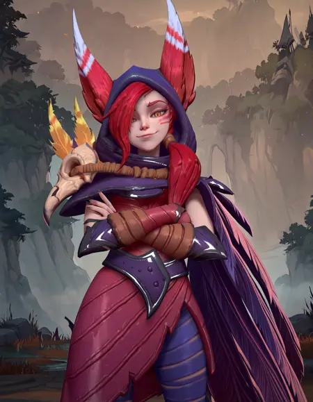 デフォルト衣装:xayah_lol_wr、頬の模様、鼻輪、猫の目、黄色い目、赤髪、ロングヘア、前髪、片方の目に髪を垂らす、動物の耳、頭部装具を通した耳、中程度の胸、フードをかぶる、フード、羽のマント、赤いドレス、ベルト、鳥の頭骨、鳥の頭骨に黄色い羽、赤いスカート、ガントレット、xayah_pants、xayah_pants_bandaged、包帯パンツ、モンスター鳥の足