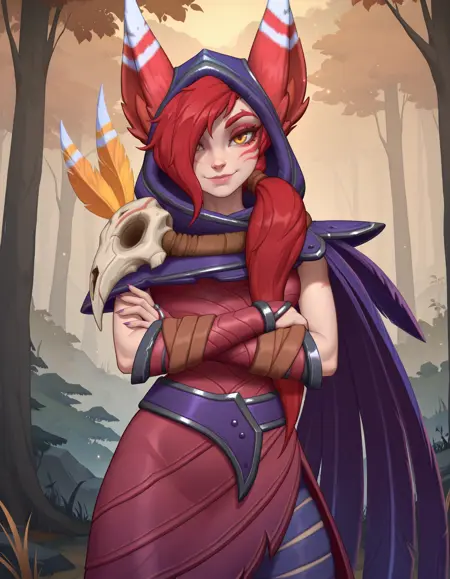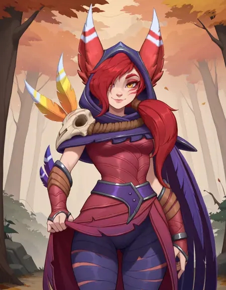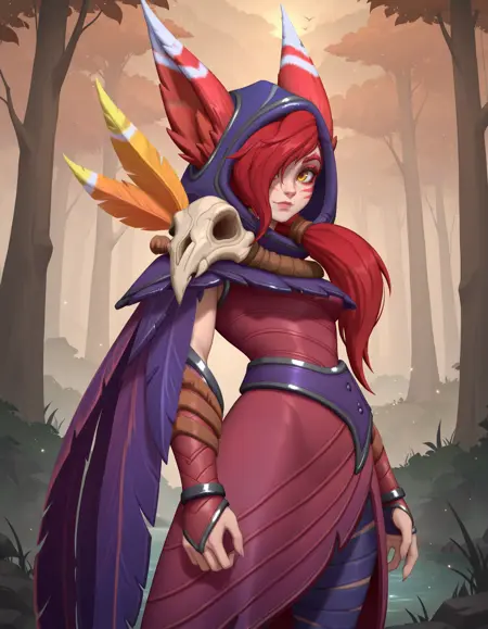 默认服装:xayah_lol_wr,脸颊斑纹,鼻环,猫眼,黄眼,红发,长发,刘海,头发遮住一只眼睛,动物耳朵,耳朵透过头饰,中等胸围,帽子拉起,帽子,羽毛斗篷,红裙,腰带,鸟头骨,鸟头骨上的黄色羽毛,红裙,护腕,xayah_pants,xayah_pants_bandaged,绷带裤,怪物鸟爪,