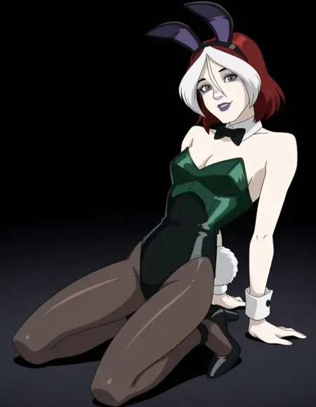 xroguex, dyed bangs, white hair, red hair, hair between eyes, (grey eyes:1.1), makeup, purple lips,