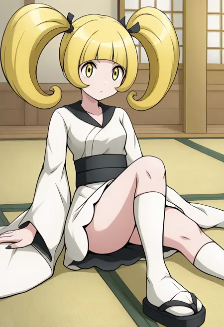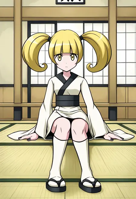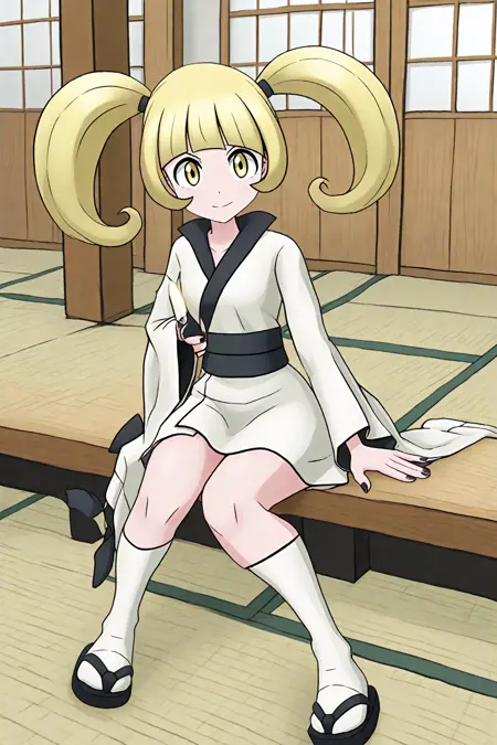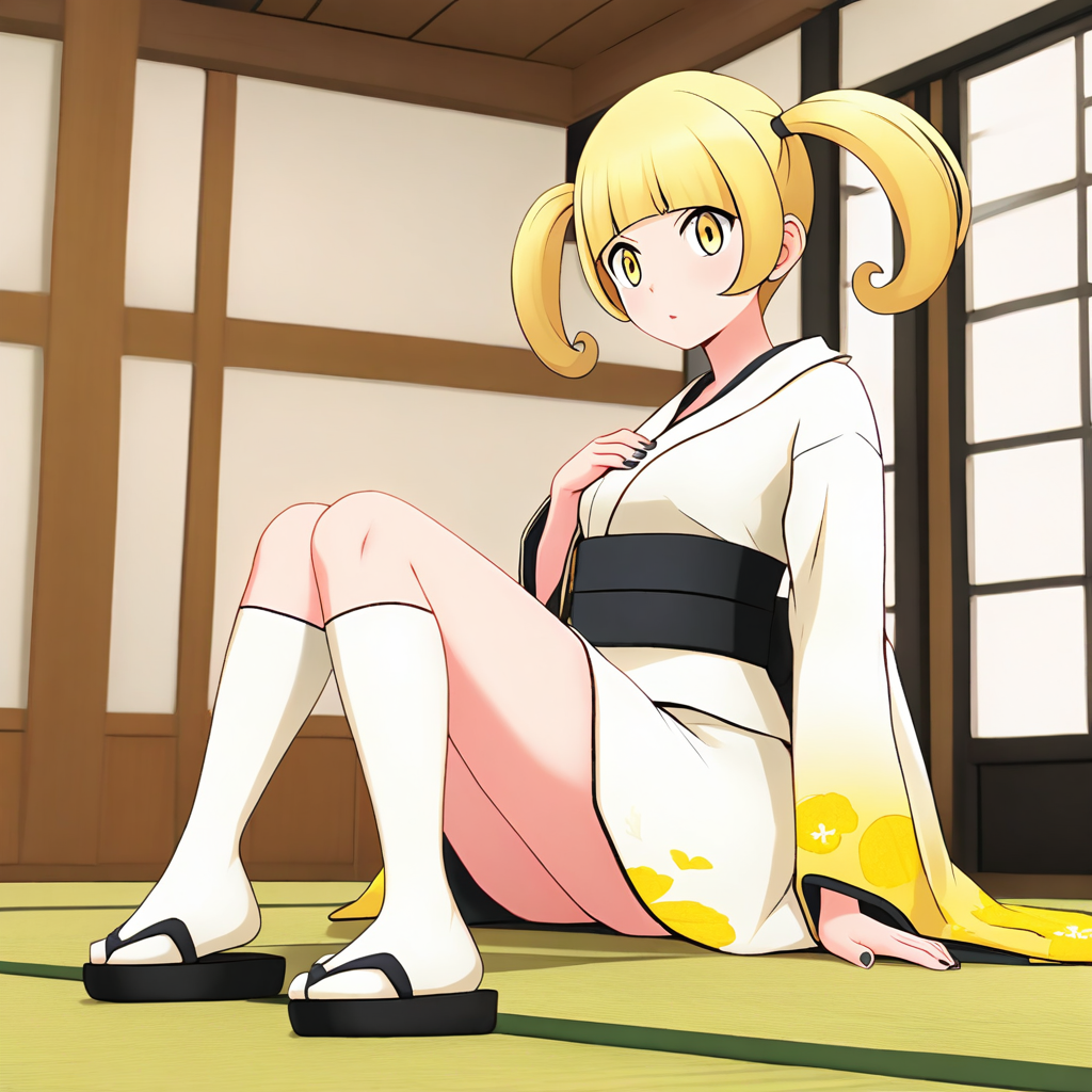 furikatherine, twintails, blonde_hair, yellow_eyes, japanese_clothes, white_dress, white_kimono, sash, wide_sleevees, kneehighs, white_socks, sandals, black_footwear, black_nails
