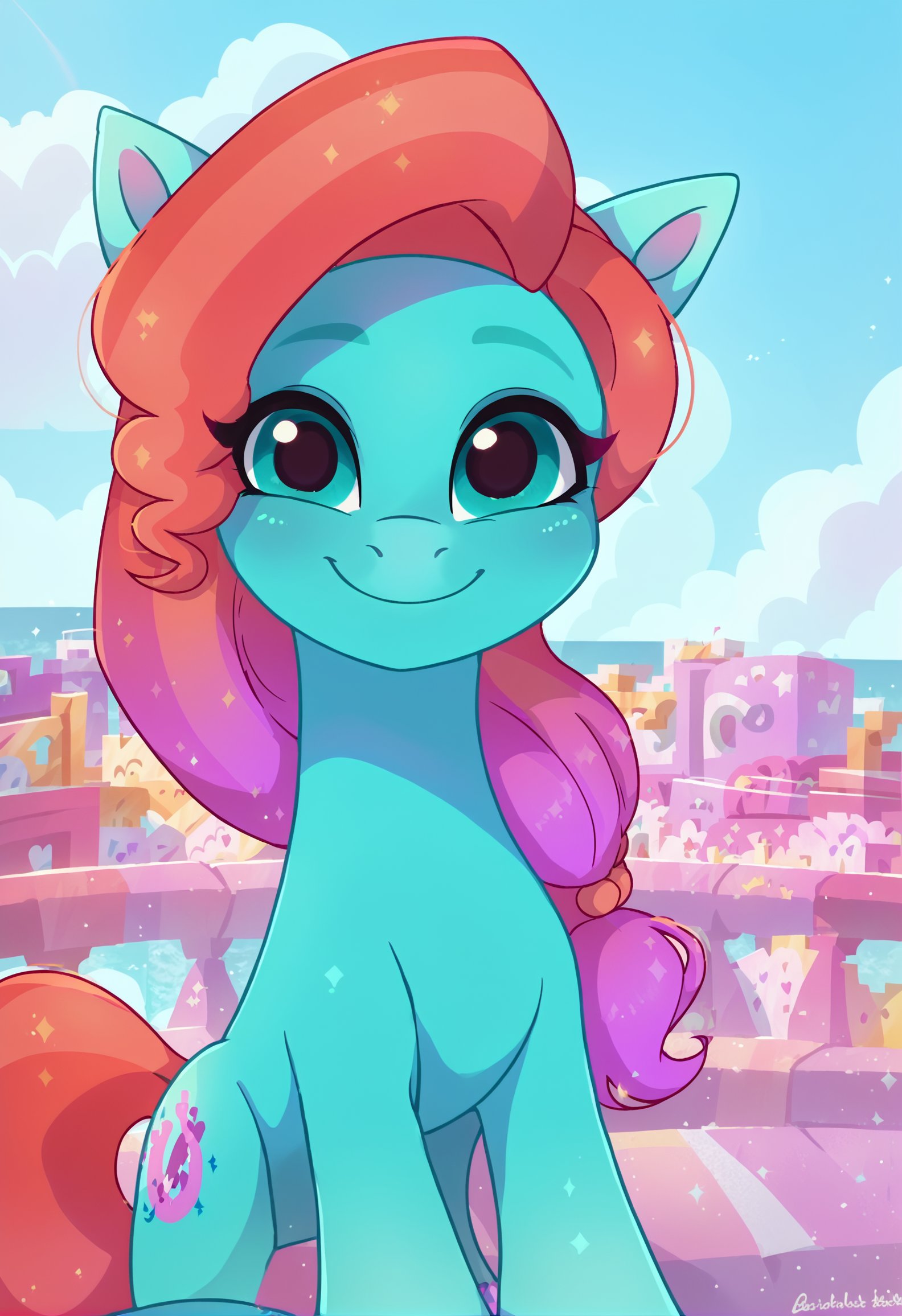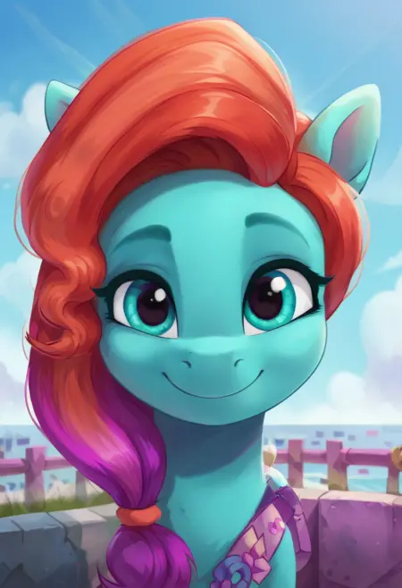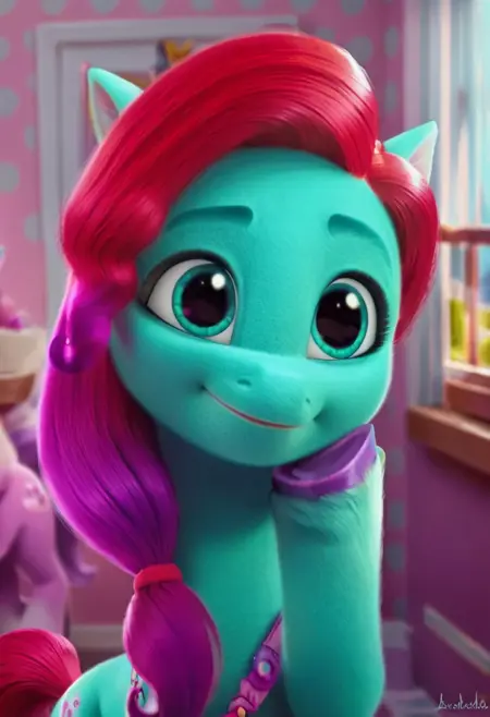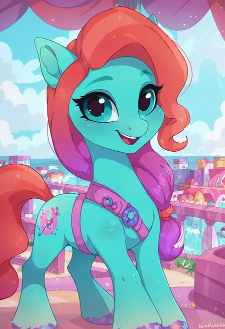 turquoise colored body, hair has a bright two-tone style, the top part is bright pink and the bottom part goes into dark purple, tied at the back with a small red ribbon, hooves are purple, small blue horseshoe symbol with a tassel on the thigh, eyes are blue