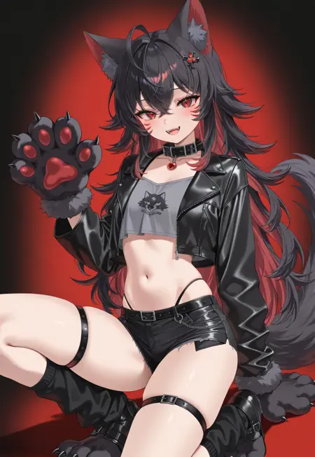 | トレーニングワード | kibawooo, 1girl, solo, wolf girl, long hair, very long hair, black hair, red hair, multicolored hair, two-tone hair, streaked hair, hair between eyes, crossed bangs, flat chest, red eyes, navel, midriff, stomach, thighs, skindentation, animal ears, wolf ears, animal ear fluff, tail, wolf tail, facial mark, claws, animal hands, shirt, grey shirt, crop top, cropped shirt, crop top overhang, open clothes, jacket, black jacket, cropped jacket, open jacket, leather jacket, underwear, panties, black panties, highleg, highleg panties, shorts, black shorts, short shorts, long sleeves, collar, black collar, animal collar, belt collar, gloves, paw gloves, leg warmers, thigh strap, hair ornament, ahoge, chair, gaming chair, legs, sitting, double v, teeth, fangs, smug, nose blush, looking at viewer, indoorsコピーしました! |