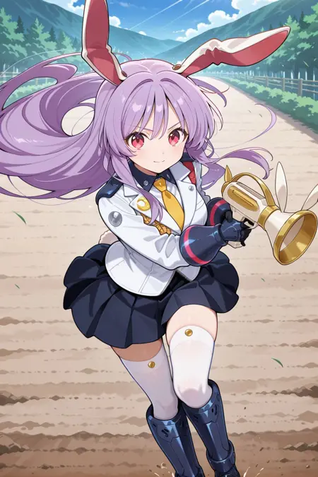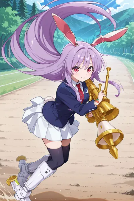 reisen udongein inaba, 1girl, solo, pink eyes, purple hair, long hair, rabbit ears, rabit tails,, reisen udongein inaba \(moonlit festival\), alternate costume, red necktie, blue blazer, long sleeves, white buttons, white shirt, collared shirt, white skirt, pleated skirt, black thighhighs, jet boots, white boots, armored boots, holding bagpipes, lunatic gun, bagpipes gun, carrot bracelet,