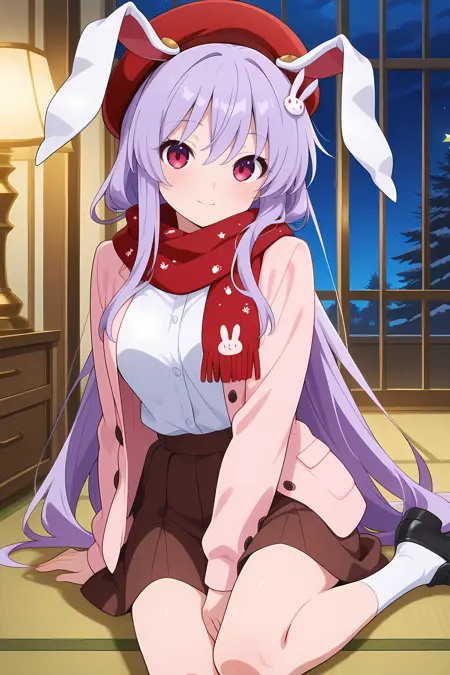 reisen udongein inaba \(snow rabbit of the holy night\), alternate costume, beret, black footwear, christmas, hat, jacket, red hat, red scarf, scarf, socks, star \(symbol\), pink jacket, white socks, brown skirt, rabbit print scarf, shirt, white shirt, open jacket, hair ornament, rabbit hair ornament,