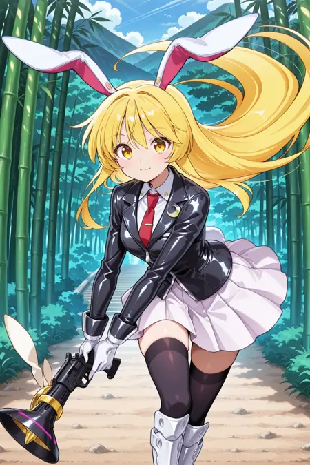 reisen udongein inaba, 1girl, solo, yellow eyes, blonde hair, long hair, rabbit ears, rabbit tails,, reisen udongein inaba \(lunatic space youkai\), alternate costume, alternate hair color, gold trims, black jacket, leather jacket, blazer, long sleeves, red necktie, gold crescent pin, white shirt, white gloves, armored gloves, white skirt, black thighhighs, armored thighhighs, white boots, armored boots, holding gun, lunatic gun, black gun,