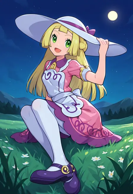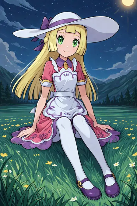 sclillie, sclilliex, green_eyes, blonde_hair, long_hair, sun_hat, white_headwear, hat_ribbon, (pink_dress), short_sleeves, collared_dress, apron, white_pantyhose, shoes, mary_janes, purple_footwear